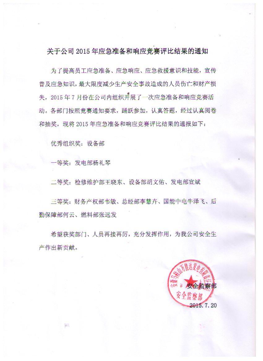 為了提高員工應急準備、應急響應、應急救援意識和技能,宣傳普及應急知識,馬鞍山項目部業(yè)主萬能達電廠于2015年7月組織開展了應急競賽,我公司牛澤飛獲得三等獎,牛澤飛是獲得獎項的唯一非電廠員工,牛澤飛的獲獎及展示了公司風貌,又體現(xiàn)項目的安全教育頗有成效,既了強化了員工的安全意識,也提高了員工處理應急突發(fā)情況的能力。